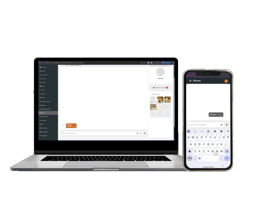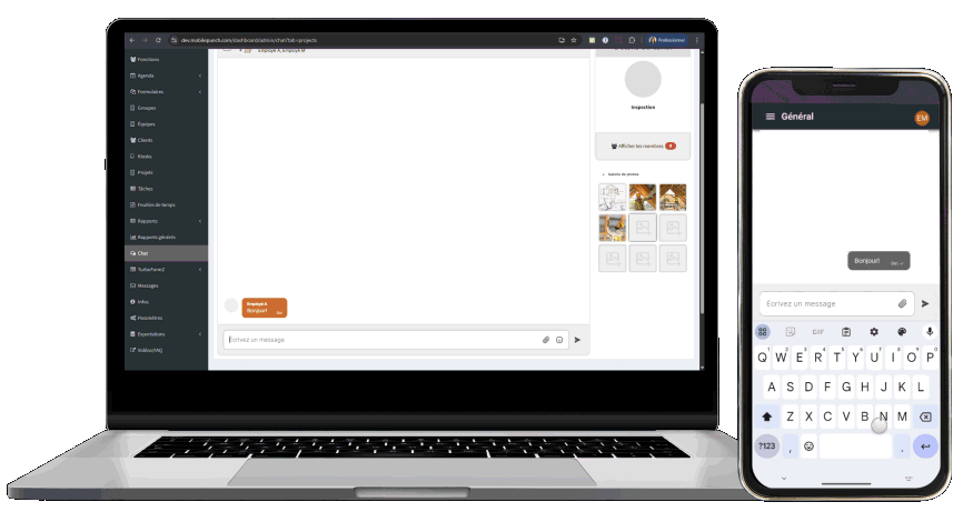 Communiquez facilement avec votre équipe grâce à l’outil de chat intégré dans l’application Mobile-Punch. Utilisez la plateforme de messagerie afin d'échanger avec les membres de votre équipe dans des canaux spécifiques ou général. Conservez un maximum d'informations liées aux projets tels que des photos et des vidéos.